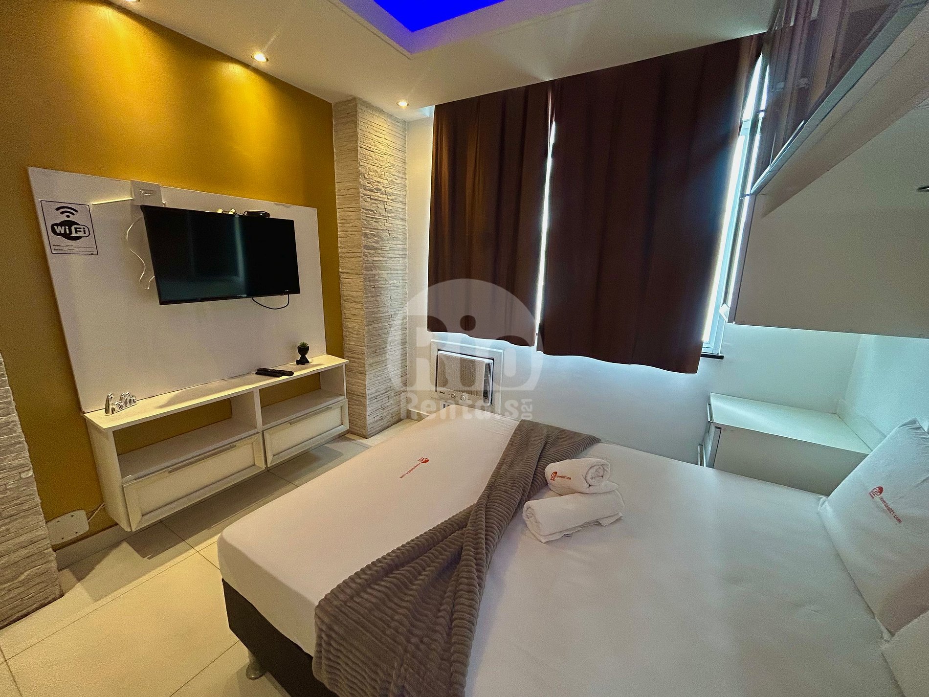 Este apartamento executivo tem uma área total de 30m² e está dividido em quarto, cozinha americana e banheiro. O confortável quarto possui uma cama de casal, sofá-cama, TV LCD e ar condicionado SPLIT. A cozinha equipada com utensílios básicos, dispõe de uma geladeira, microondas, fogão cooktop de 4 bocas e cafeteira. Além da hidromassagem, o apartamento de luxo tem teto rebaixado com iluminação indireta, garantindo assim uma hospedagem maravilhosamente agradável. Serviços adicionais, tais como Internet sem fio e TV a cabo, já estão incluídos no preço do nosso apartamento temporada executivo no Rio de Janeiro.